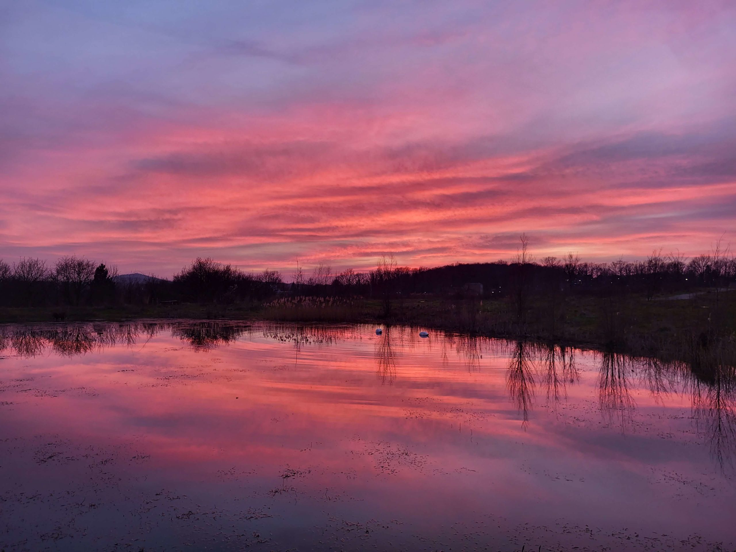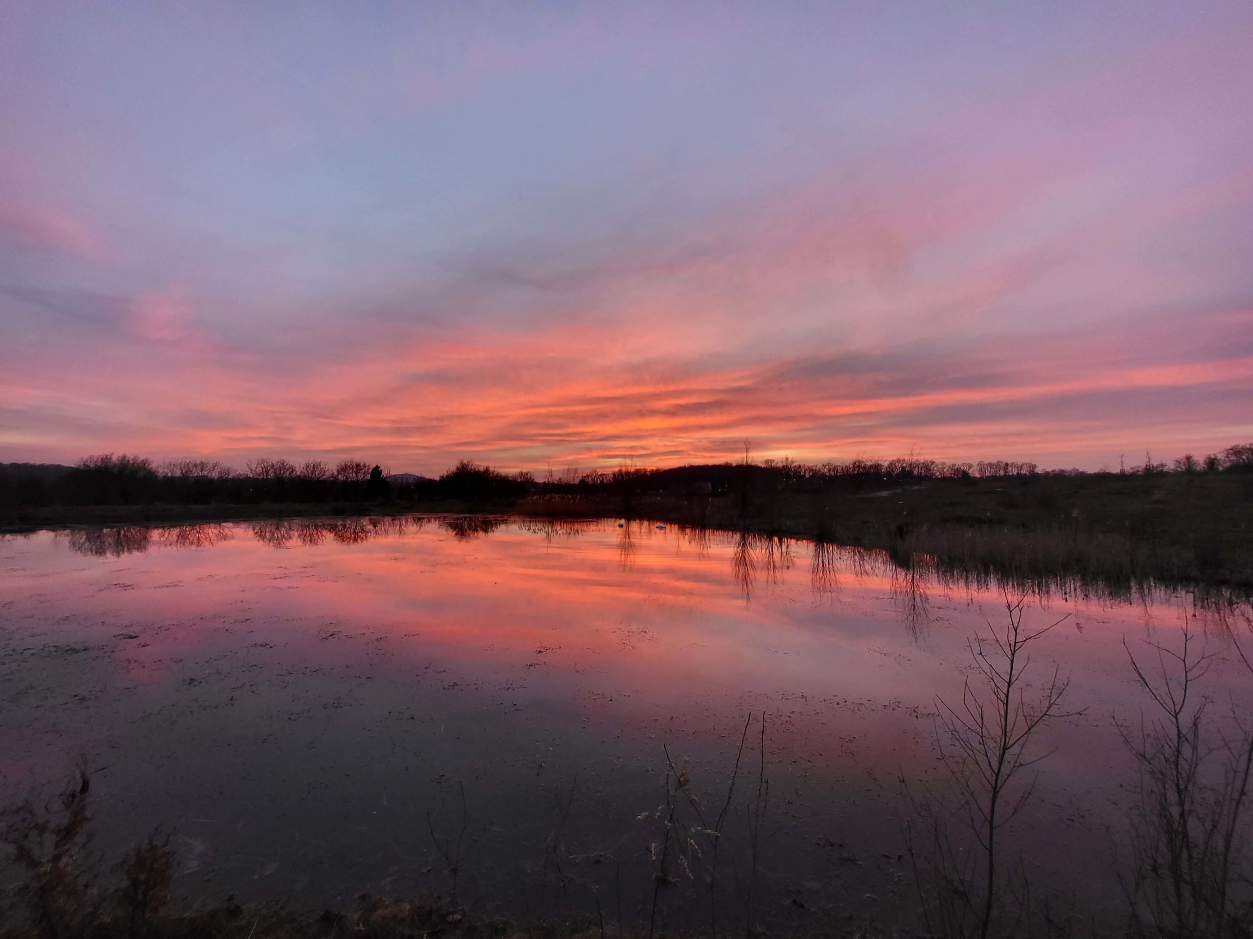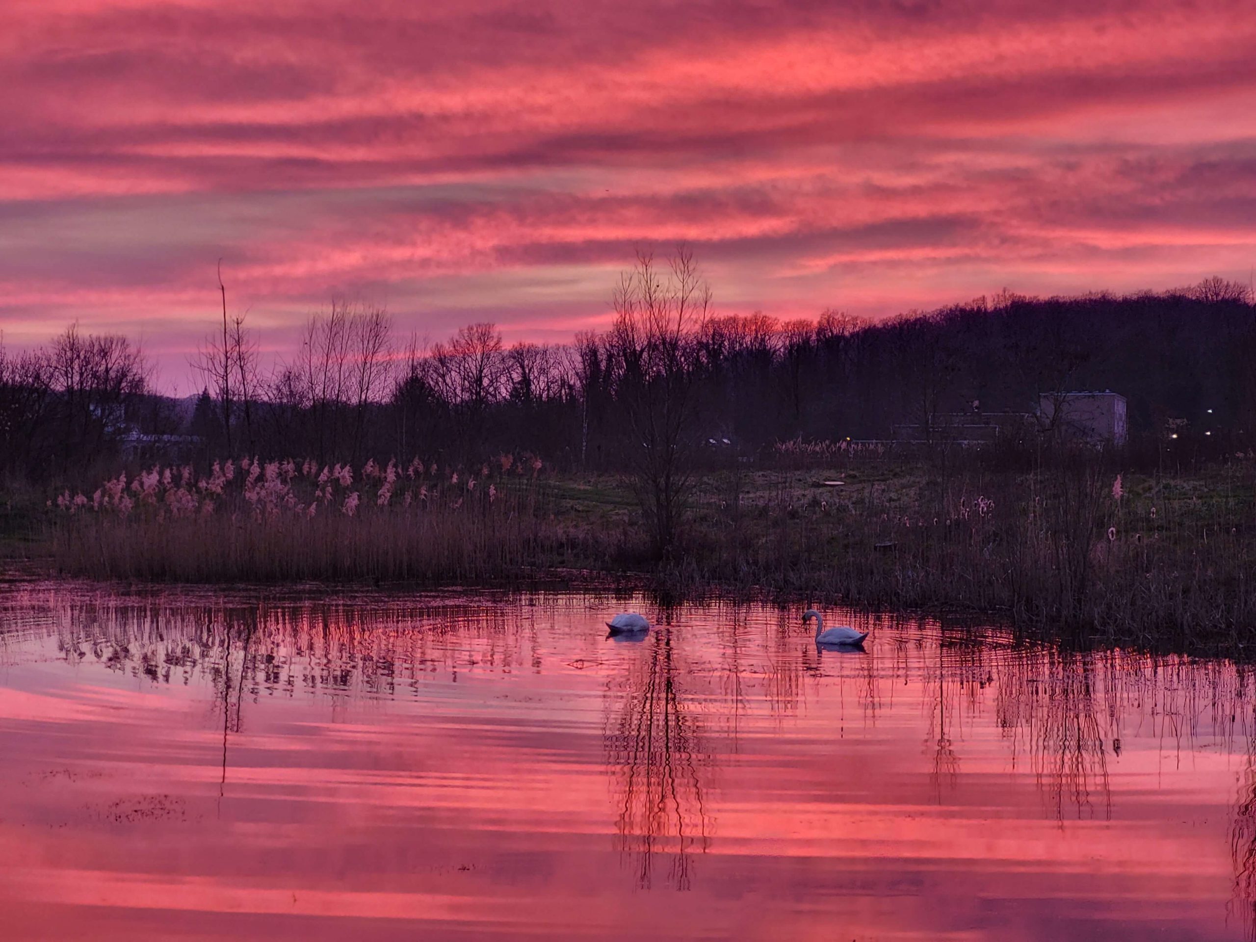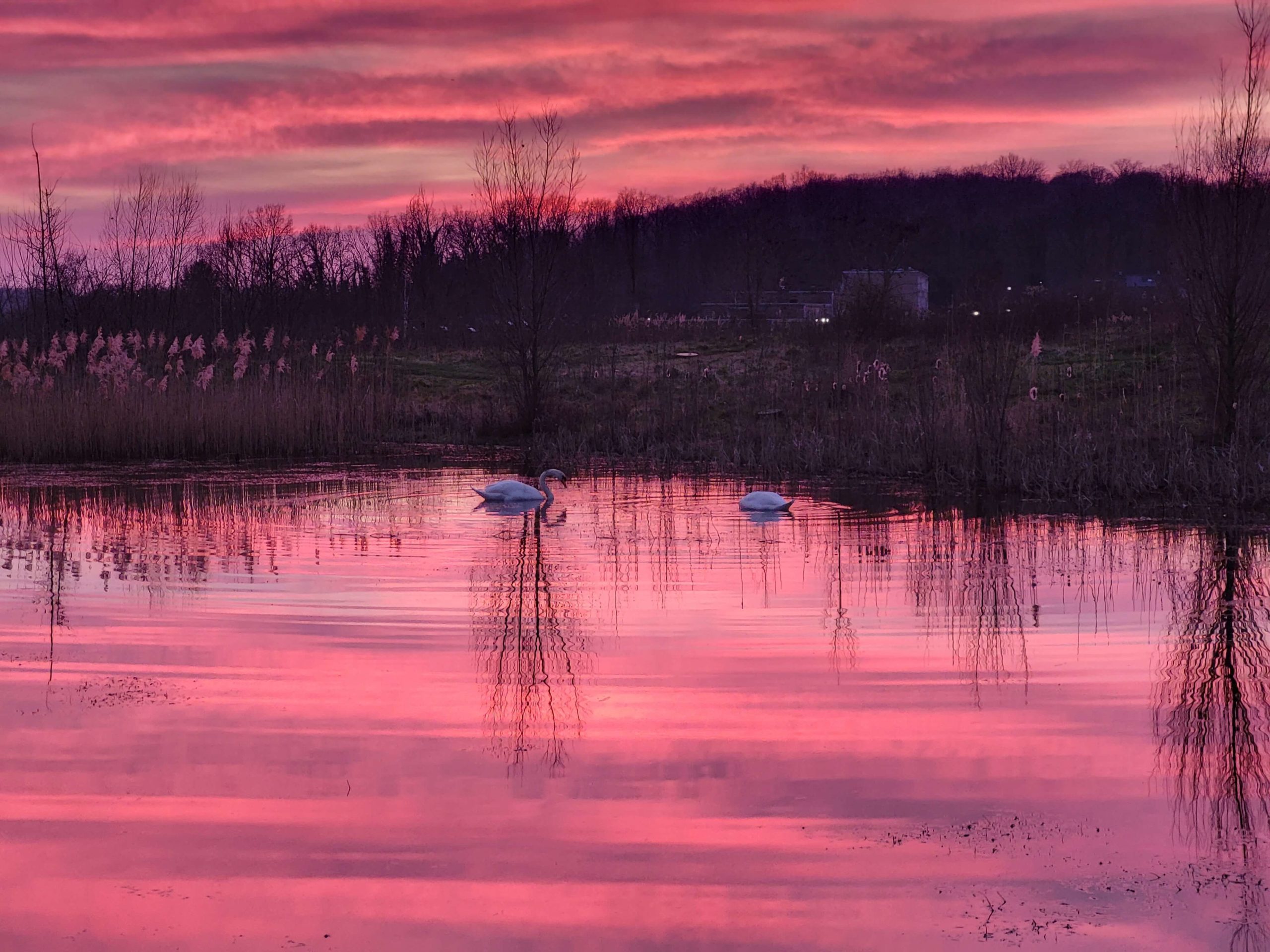 Ook tijdens de zonsondergang heeft het natuurgebied van Eygelshof zijn charme. In het water is er een afspiegeling te zien van de verschillende kleuren die dansen in de lucht. De zwanen zijn geborgen in de warmte van het avondrood en maken zich op voor de stilte van de nacht, wachtend op weer een nieuwe dag…